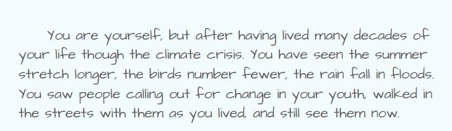 Your grandkid Alaina is scared about what she will have to live through, and she wants to know how you felt back when you were younger, before you saw what was to come.