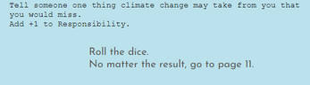 Use the prompts to have a conversation with your grandkid and explore your experiences and feelings around climate change. Roll to get words that make up a climate poem. Take real life actions to care for nature, yourself, and others, boosting your rolls and swaying the poem towards a positive direction.
